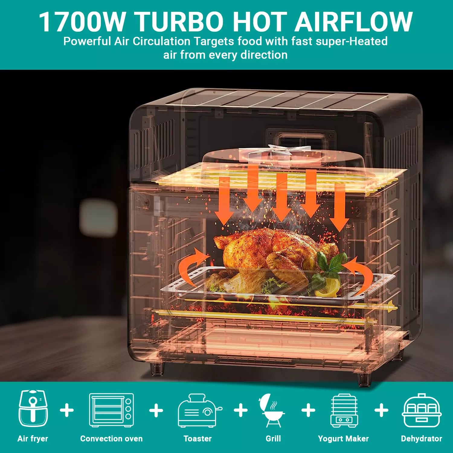 - Fast, No-oil, Healthy: Its 1700W strong Power makes it super-Efficient to cook food in the Healthiest way by cutting over 85% of fats. Equipped with a large glass viewing window and an inner illuminated cooking chamber, make it is easy to monitor the cooking progress. A brushed Stainless Steel exterior enhances any kitchen decoration.