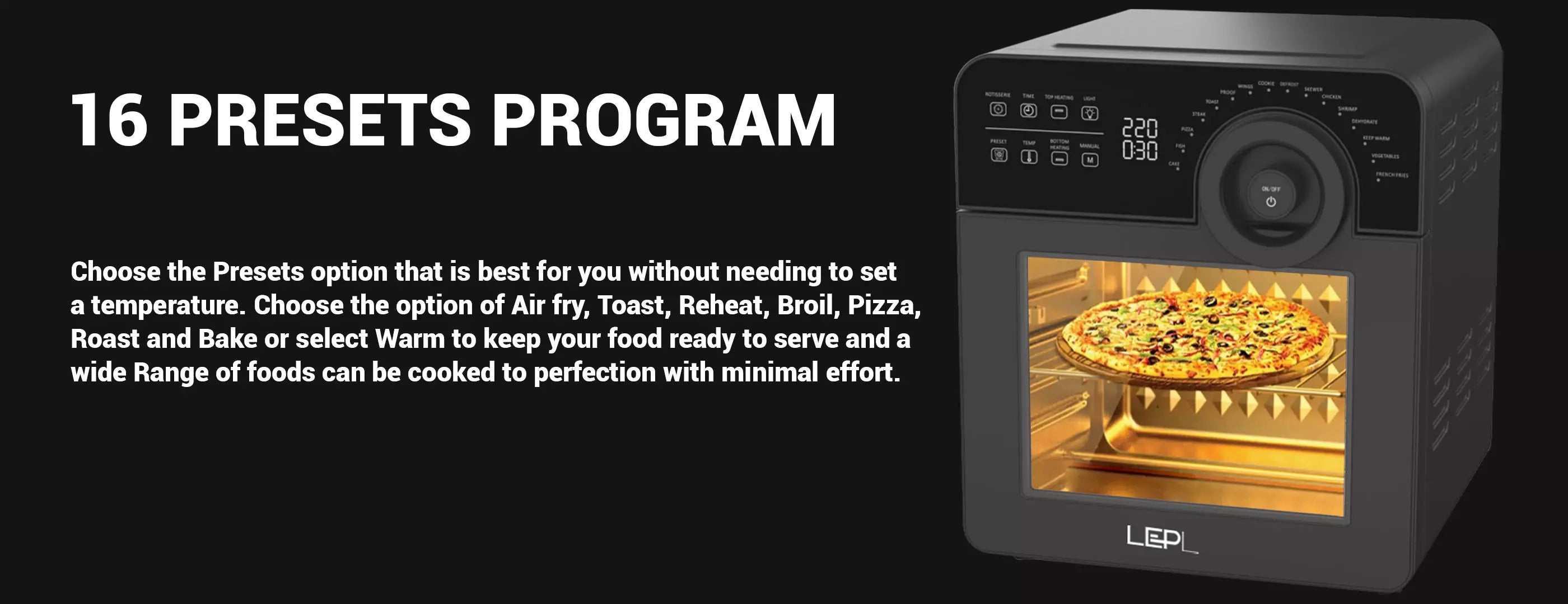 - 16 Presets Program: Choose the Presets option that is best for you without needing to set a temperature. Choose the option of Air fry, Toast, Reheat, Broil, Pizza, Roast and Bake or select Warm to keep your food ready to serve.