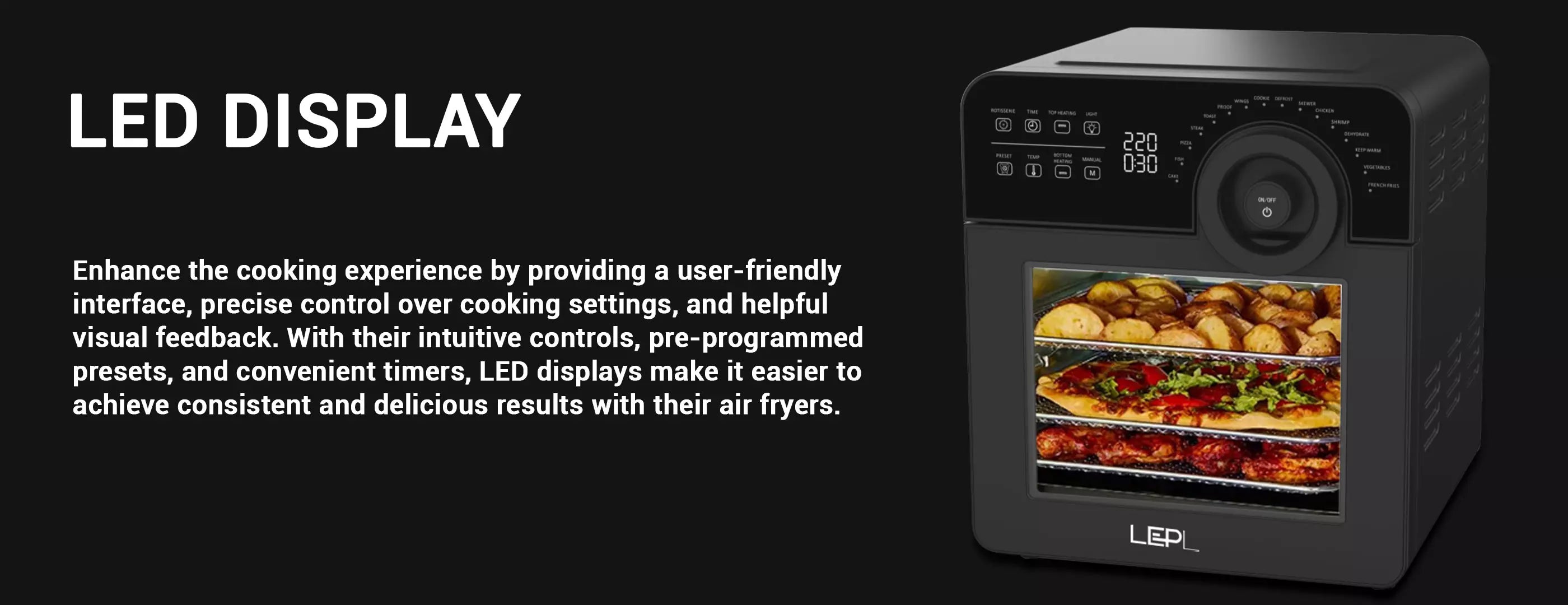 - LED display: A digital screen on the air fryer shows the cooking settings, temperature, time, and other relevant information.